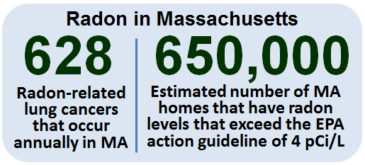 Radon also increases the chance of lung cancer in people that smoke. For those who are exposed to elevated indoor radon levels, people who smoke have up to 10 times the risk of developing lung cancer than people who have never smoked. MA EPHT's radon page features a radon risk table and a map of radon zones in Massachusetts.